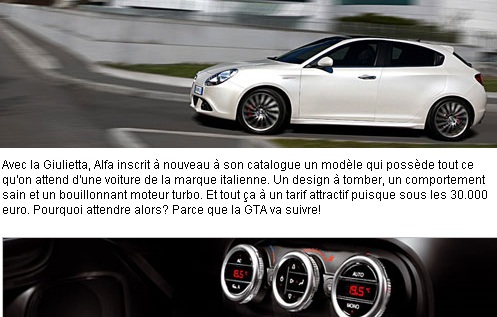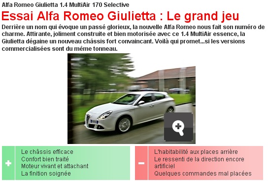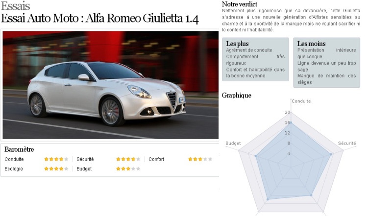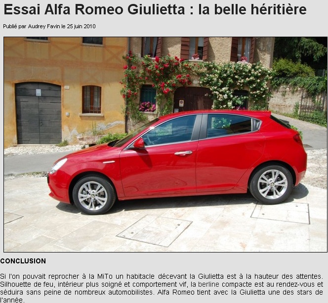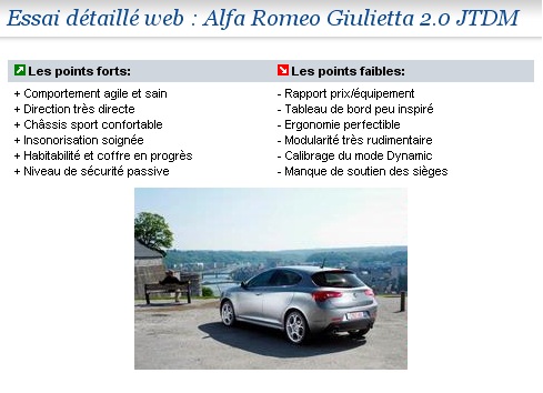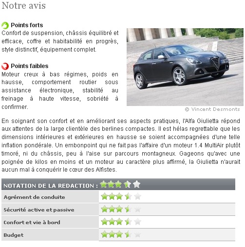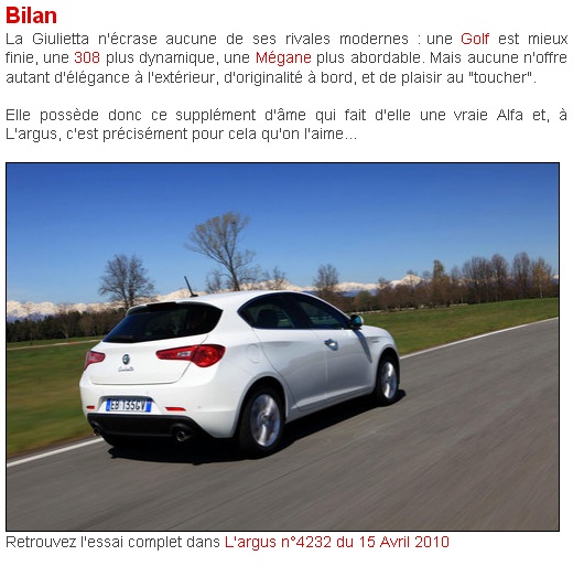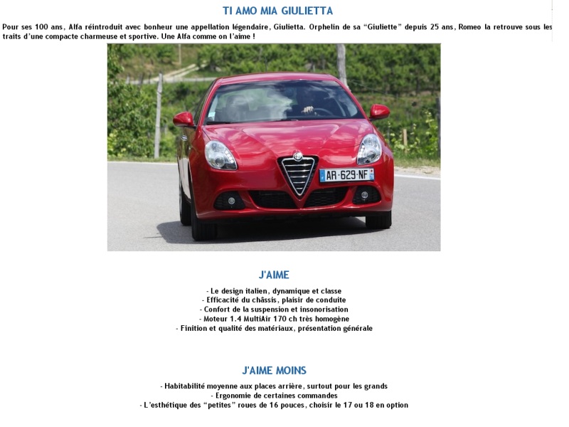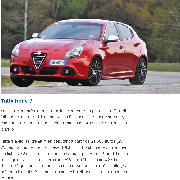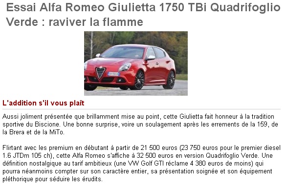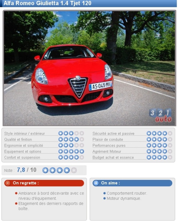 Surtout que pour l'A3 on omet volontairement de parler du manque de reprise du moteur: 7s de plus que la Giulietta sur 80-120. un gouffre !!!, Et pour la Giulietta on dit qu'elle consomme plus que les autres (une misère !) en oubliant qu'elle a les meilleures reprises en 6 ! _________________ ALFA GIULIETTA 1.4 TJET 120 DISTINCTIVE